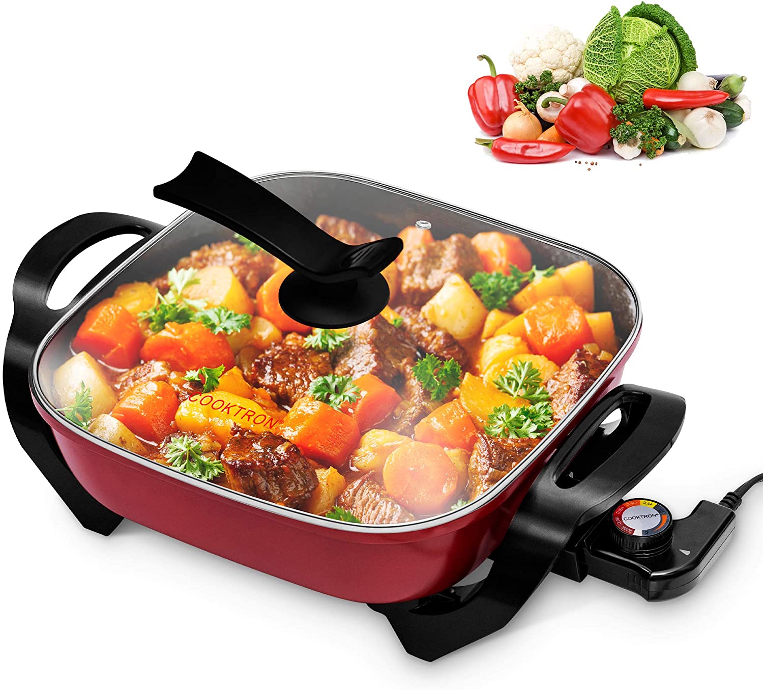 COOKTRON Nonstick Electric Skillet, 12" Square Electric Pan with Glass Lid & Temperature Control Electric Cooker for Grill, Simmer, Steam and Stew, 5.2QT, Red